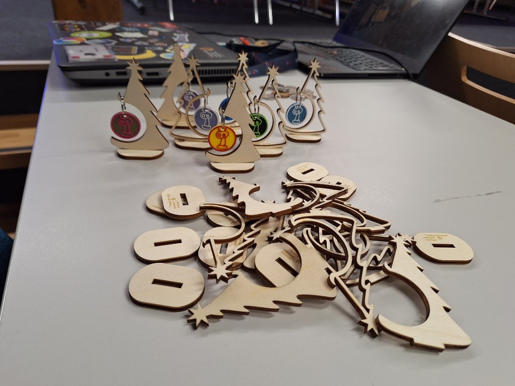 Vyrobeno s láskou na Půdě v Městské knihovně Polička z topolové překližky 4 mm a 3D tisku. Velikost cca 10 cm, přívěsek žetonku/baňky 2–2,5 cm.